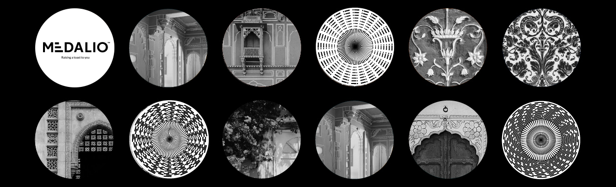 Medalio’s identity is built on aspiration, elegance, and warmth. At its core lies the medallion—a symbol of prestige and progress—seamlessly woven into the brand’s visual language. To further enrich this identity, we crafted a bank of six custom medallion patterns. These intricate dials with radial geometry, serve multiple purposes — as standalone visual artifacts, background textures, and as visual motors when in motion.
