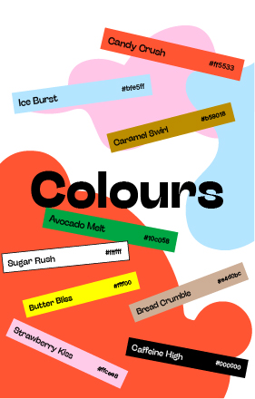 The core color palette kept things simple but sunny: classic black and white, plus a punchy yellow that radiates good vibes. Then came the flavour pops, a supporting cast of colours inspired by desserts themselves. Think caramel swirl browns, candy crush reds, to strawberry kiss pinks, sprinkled into product-focused storytelling.