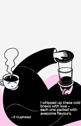 Cakehead’s got a cupcake for a head and is always caught in a whirlwind of whisks, sugar swirls, and plated desserts. Cuphead, with a coffee cup for a head, is usually busy sniffing beans, pouring the perfect brew, or just vibing with his plants. Together, they bring the brand’s flavour to life, one pastry and pour at a time.